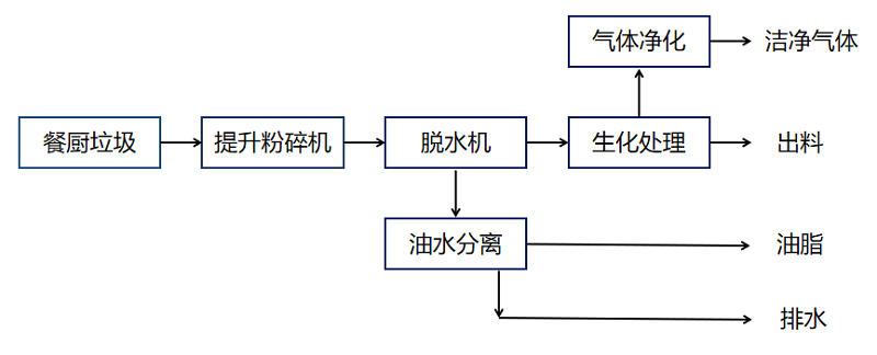 采用工藝:餐廚垃圾+提升粉碎機+脫水機+生化處理+出料/排出潔凈氣體/排水/排出油脂
